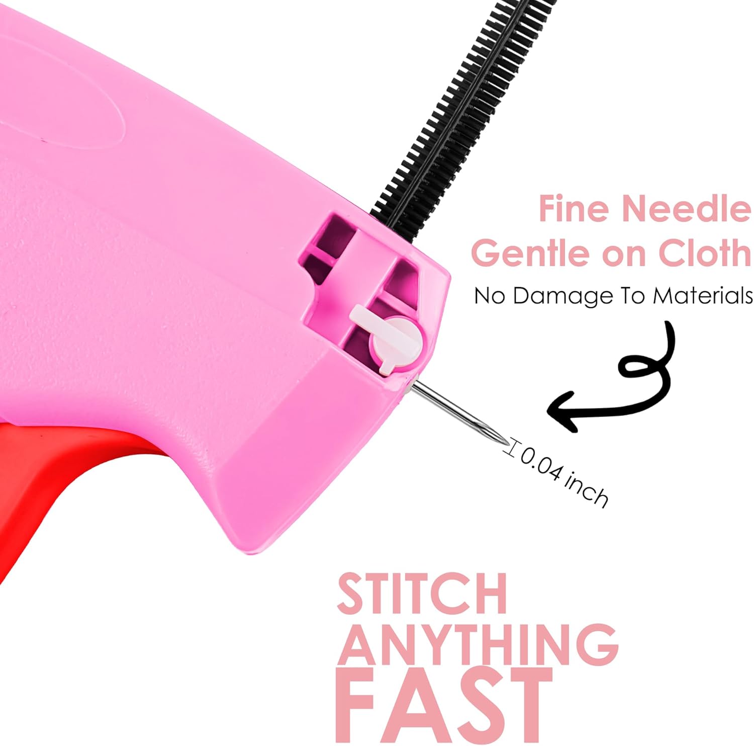 A compact Pink-Red stitch gun designed for fast, nearly invisible clothing repairs. Includes 6 needles and 2000 fasteners, making it ideal for DIY users, boutiques, and tailors.