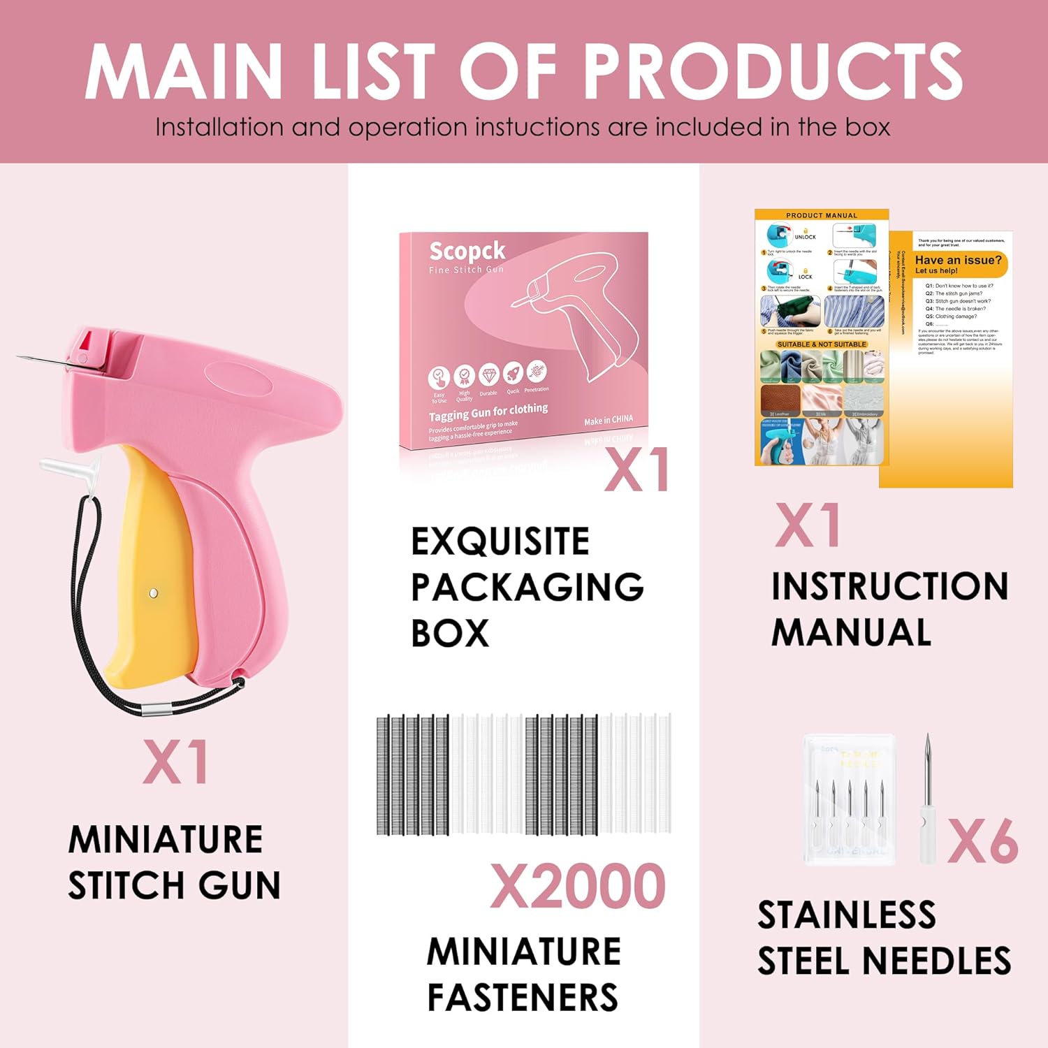 Stitch Gun for Clothes – Handheld Stitch Gun Quick Clothing Fixer – Mini Sewing Kit Micro Tagging Gun – Includes 6 Needle, 1000 Black Fasteners & 1000 White Fasteners (Pink-Yellow)