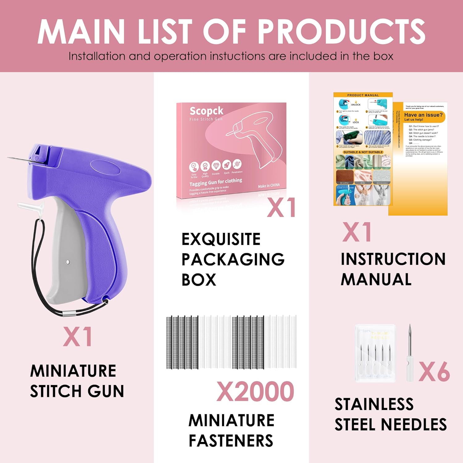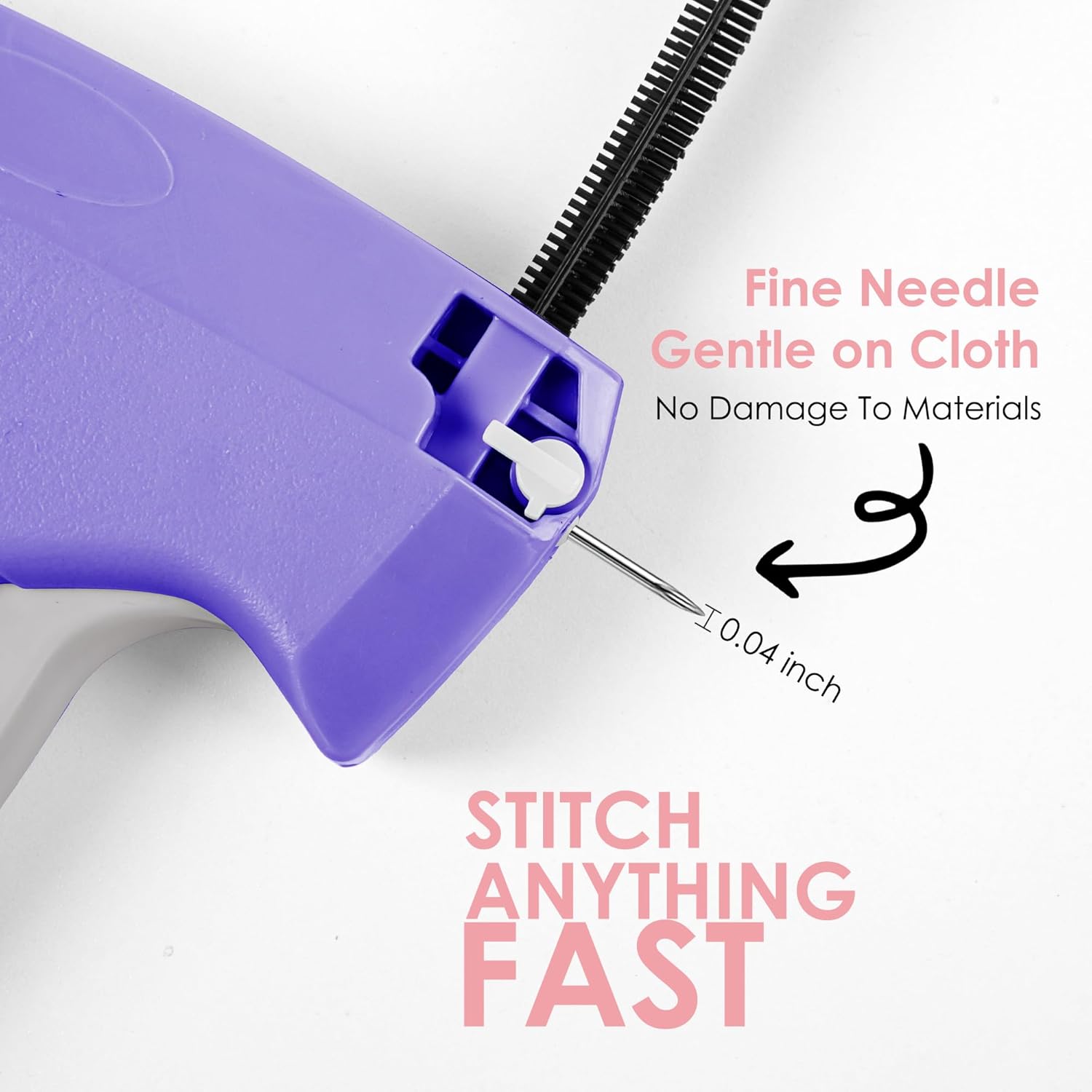 A manual stitch gun designed for quick, nearly invisible repairs on multiple fabric types. Includes 6 needles and 2000 fasteners, making it ideal for home, DIY, and tailoring use.